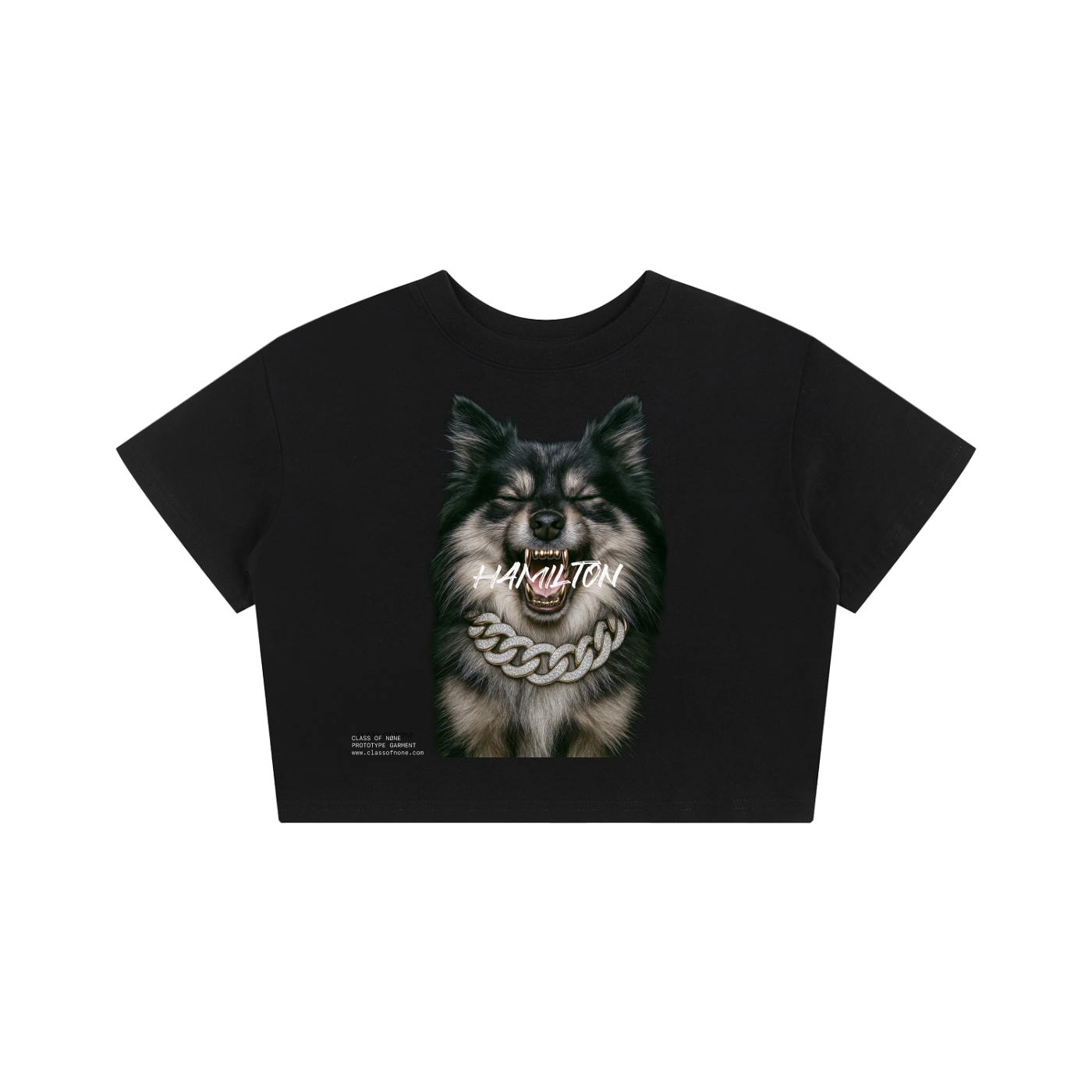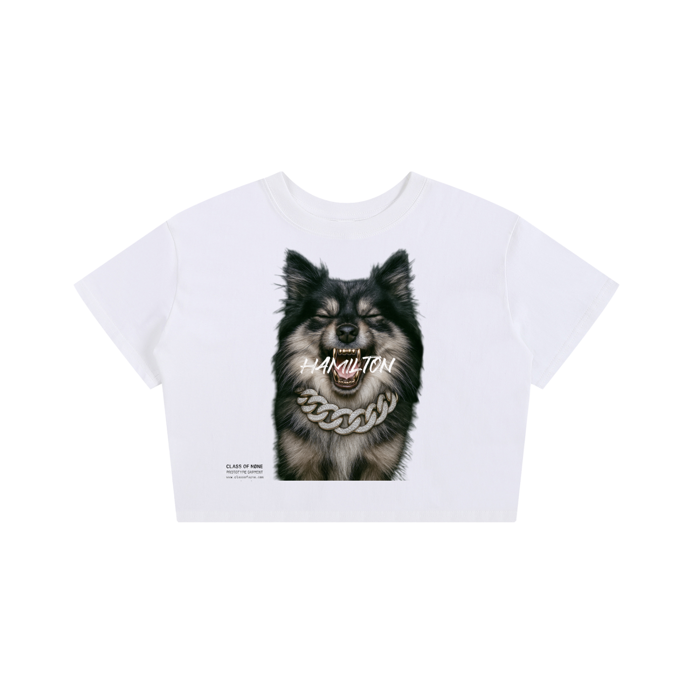 Upload a photo—we’ll animate your pet in the bold, hyper-real, street-luxury style shown : grills, diamond chains, dramatic lighting, and a clean black backdrop. This becomes a one-of-one design printed on your baby tee.